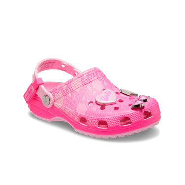 El nuevo Zueco Clásico de Barbie™ es el zapato perfecto para las íconos de la moda. Este estilo, cómodo y elegante, viene en un tono rosa con un elegante estampado de monograma integral. Haz brillar tu look con los elegantes charms Jibbitz™ de esmalte que incluyen una Dreamhouse™, un patín, una palmera, gafas de sol con forma de corazón y el logotipo de Barbie™.